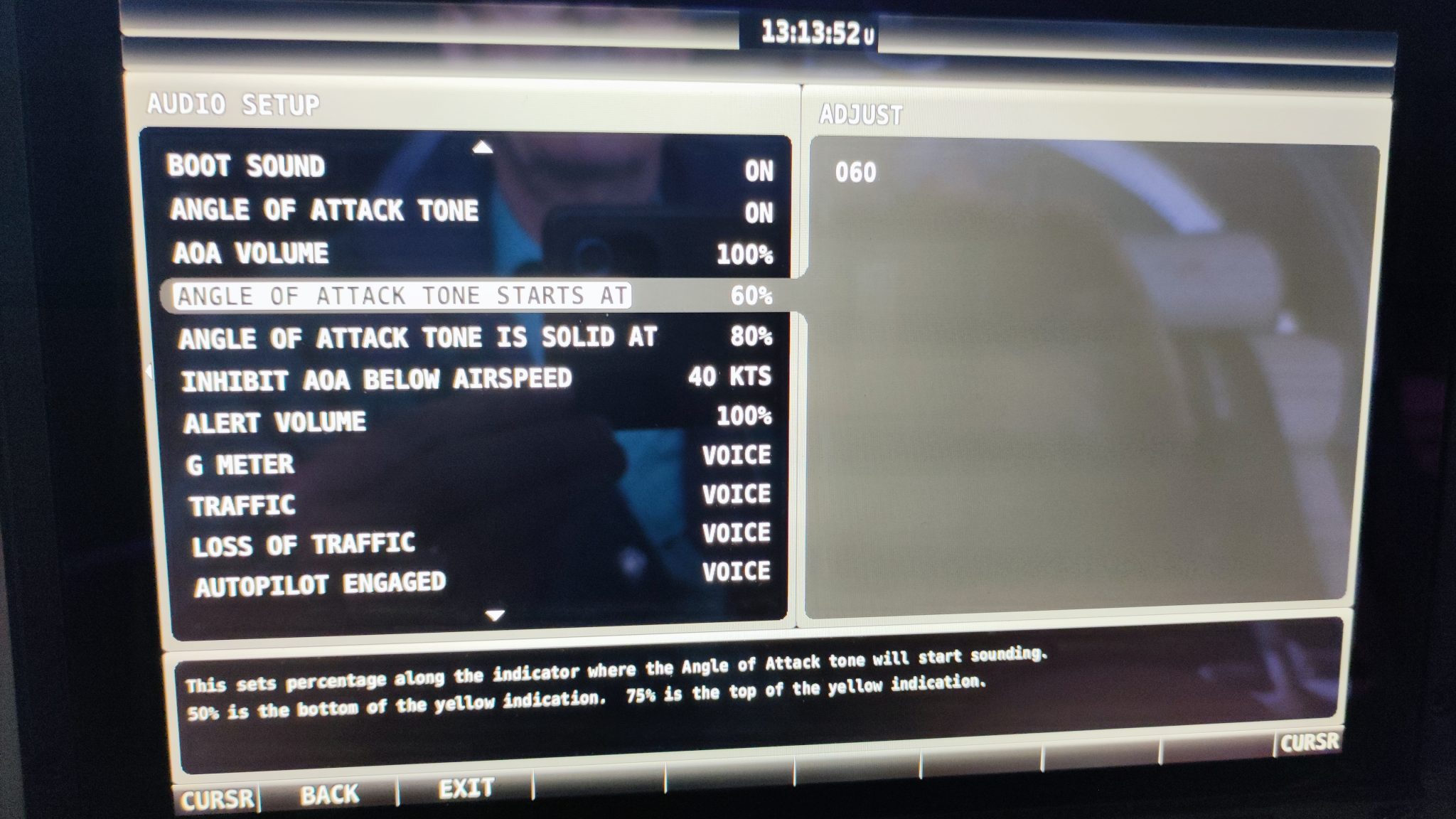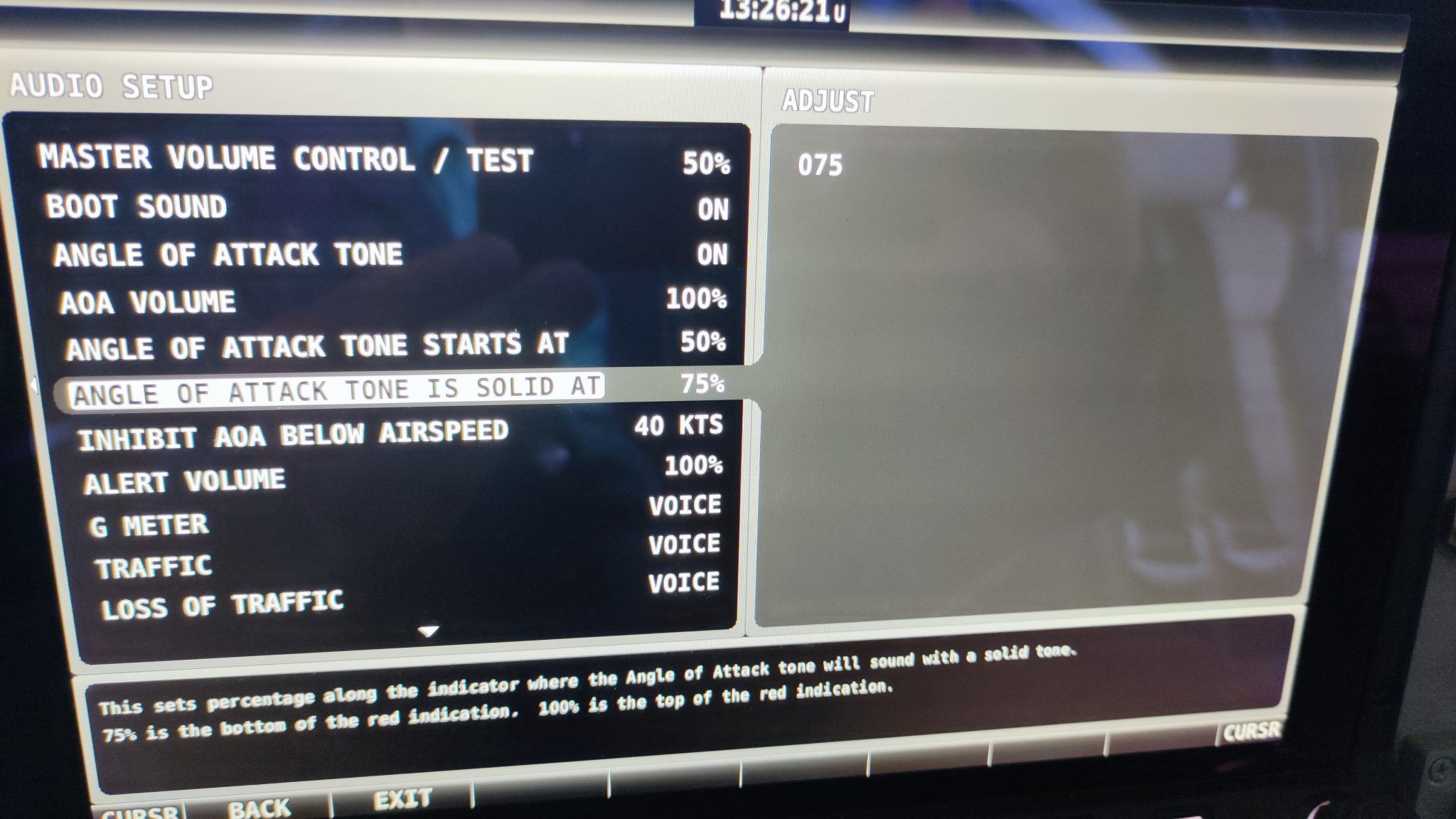 Zu 1: Die Stall-Warning konnte ich im Setup verändern. Die Schwelle zum Einsetzten der „Stall-Annäherungs-Warnung“ (pulsierender Ton) konnte ich von Mitte (60%) dauf Anfang (50%) des gelben AOA-Bereichs verschieben. Die Schwelle für die „Stall-Warnung“ 8(ständiger, lauterer Ton) habe ich von 80% auf 75% ändern können, was jetzt oberes Drittel des gelben AOA-Bereichs entspricht. Hiermit bin ich an der niedrigsten Einstellgrenze angekommen. Im Flug muss ich testen, wie sich dies in Knoten bemerkbar macht.