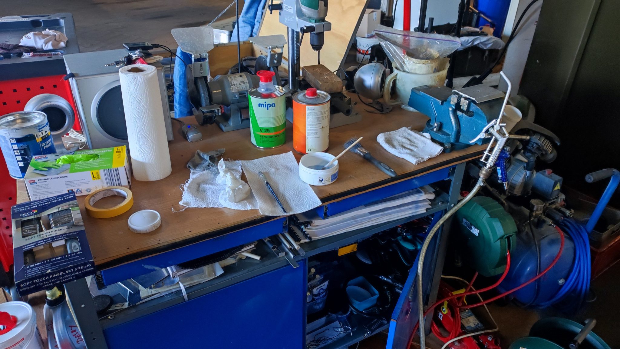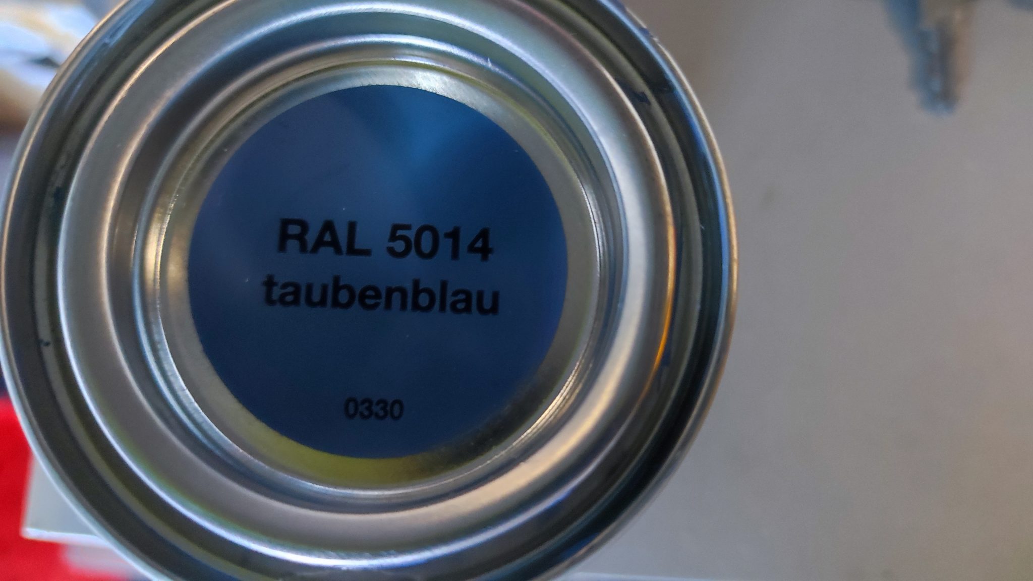 Im Baumarkt habe ich keine RAL 7031 gefunden. Ein ganzes Kilo wollte ich mir bei MIPA nicht anmischen lassen. Ich bin jetzt auf Taubenblau RAL 5014 ausgewichen. Die Cowling und das Bugfahrwerk sowie Teile des Motorträgers habe ich mit Akzo Nobel 2k Primer geprimed und innerhalb 45 Minuten lackiert. Die Cowling mit Verkehrsweiß RAL 9016 gespritzt, Motorträger und Fahrwerk mit dem Pinsel mit normaler Kunstharzfarbe. Letztere kann also bei Bedarf auch wieder abgewaschen werden.