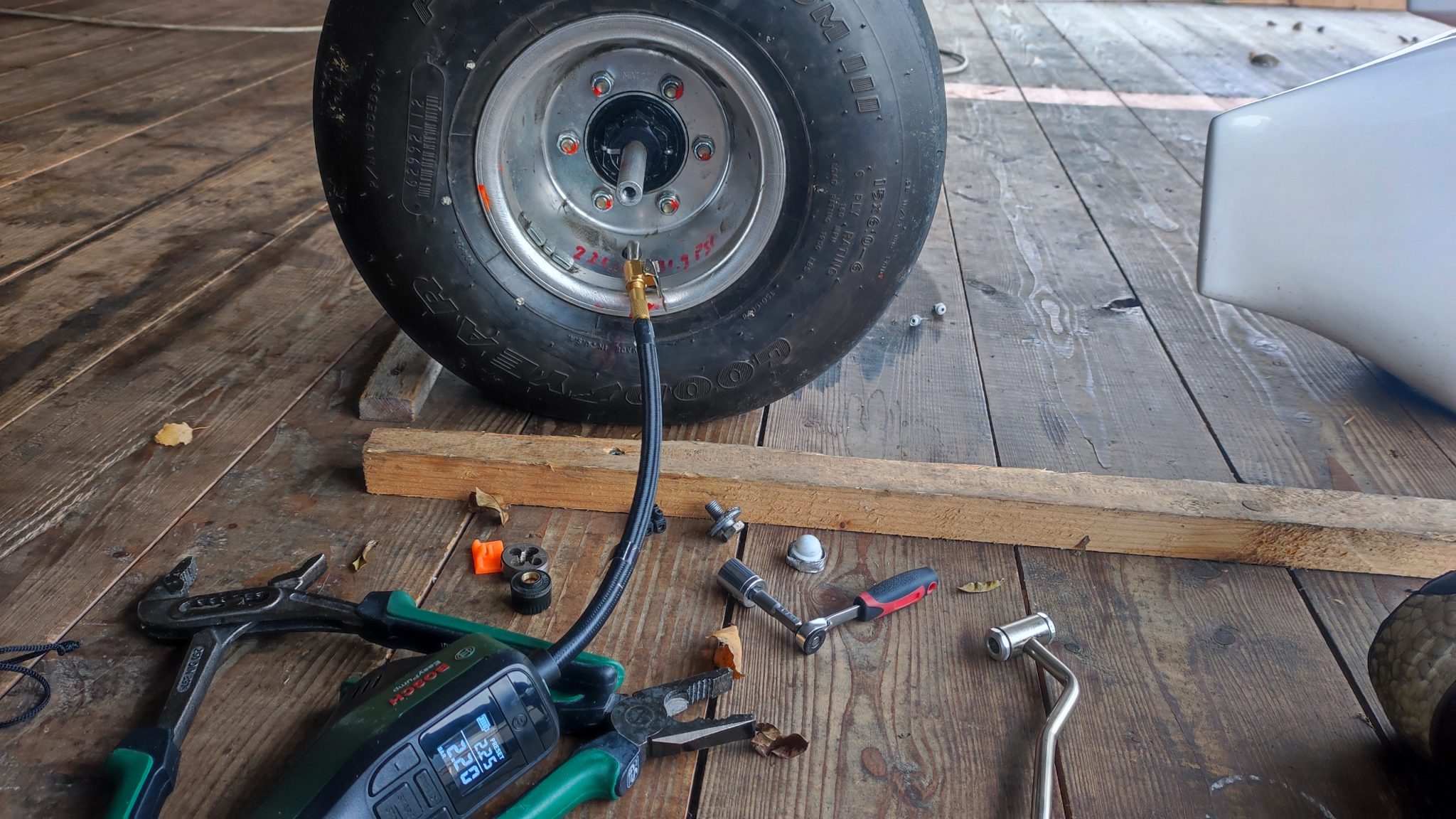 Heute hat das Wetter für das Erfliegen der T/O-Performance Daten mit RPM 5500 und 600 kg gepasst. Der Wind war etwa 5 bis 7 kts aus Westen. Mit passender Beladung bin ich mit 605 kg das 1. Mal gestartet. Pro Platzrunde verbrauche ich etwa 2 kg Sprit. So wäre die letzte der 8 geplanten Starts mit 591 kg erfolgt. Bis zur 6. Landung verlief alles bestens. Beim Abrollen von der Bahn nach rechts, stellte ich ein ungewöhnliches Steuerverhalten fest. Das Treten ins rechte Ruder und damit durch das durch Gestänge gekoppelte Nose Wheel nach rechts erschien mir schwerer als sonst. Beim Geradeauslauf spürte ich ein eindeutiges Ziehen des Fliegers nach links. Ich vermutete einen flachen linken Reifen. Ich sah sofort auf der FOBO Reifendruck App nach und musste sehen, dass die letzten Daten für dieses Rad 50 Minuten alt sind. Die beiden anderen Reifen wurden wie gewohnt mit weniger als 4 Minuten alt angezeigt. Daraufhin brach ich die Erprobungsflüge ab und rollte noch zum Hangar. Dort bestätigte sich der Flat Tire. Ich bockte den Flieger auf, damit ich das Rad drehen konnte um zum Ventil zu gelangen. Der Versuch, den Reifen wieder aufzupumpen schlug fehl. Das Ventil war an der Felge zur Hälfte abgerissen. Der Druck-Sensor fehlte. Er muss wohl abgedreht worden sein, denn das Gewinde in der 90° Verlängerung war noch in Ordnung. Ich konnte am Felgenrand entsprechende Spuren entdecken, dass hier etwas „eingeklemmt“ war. Ich ließ den Flieger wieder ab und schob ihn mit Hilfe von 2 Männern in den Hangar. Dort baute ich den Spat ab und das Rad. Ich wollte wissen, ob der Reifen auch Schaden genommen hat und zerlegte die Felge. Aber leider ist der Schraubstock im Hangar zu klein, als dass ich den Reifen von der Felge bekommen hätte. So nahm ich das Rad mit Nachhause. Bei Tost habe ich passende Schläuche gefunden. Die sind vorrätig und haben ein 90° Ventil. Die besorge ich morgen. Den verlorenen FOBO Sensor wollte ich einzeln bestellen. Das wäre aber nur aus USA gegangen. So habe ich mir noch einmal ein Set von 2 Sensoren bestellt. Somit habe ich jetzt einen in Reserve.