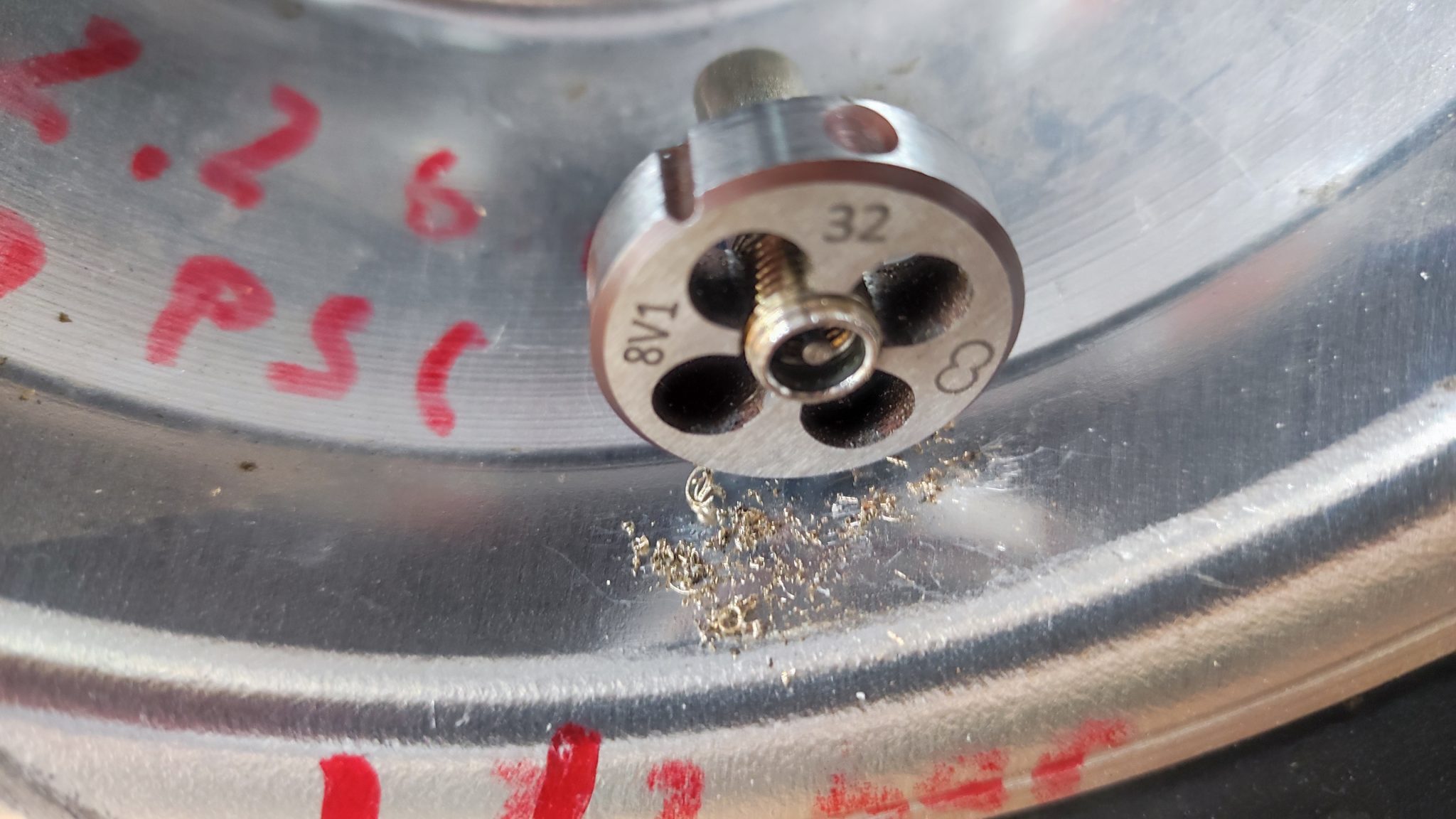 Das Gewindeschneideisen ist nach langer Zeit endlich eingetroffen. Heute habe ich die Gewinde der Ventile beider Hauptradschläuche nachgeschnitten. Der Sensor passt jetzt perfekt, so wie es sein soll.