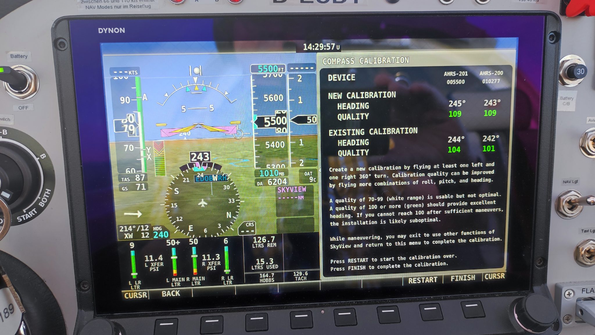 Heute war phantastisches Flugwetter. Somit habe ich die AOA Calibration gleich geflogen, genauso wie die Compass Calibration. Diesmal habe ich die Quality Werte von 109 erreicht. 10 Kreispaare bin ich geflogen.